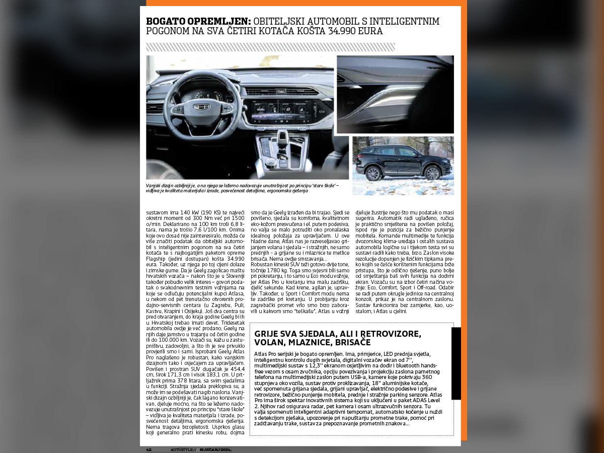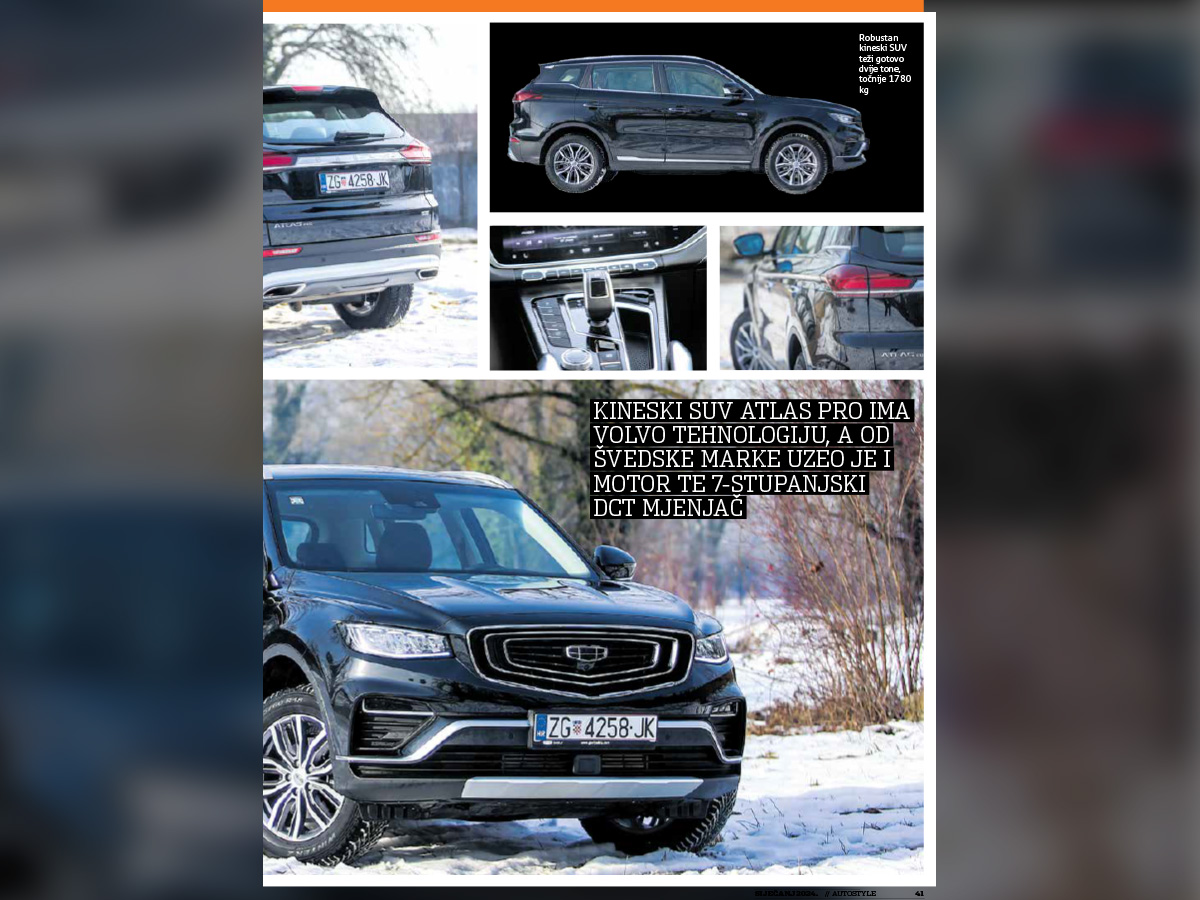 Sad smo već u fazi kad kineski automobil na hrvatskim cestama nije svjetsko čudo, a sve je manje i onih koji viču "nikad kineza", bez da su i sjeli za upravljač nekog od modela pristiglog iz Kine. A markama koje su tu otprije na samom se kraju 2023. godine pridružio Geely, jedan od najjačih svjetskih proizvođača automobila, najprodavanija marka osobnih vozila u Kini, vlasnik švedskog Volva, većinski vlasnik britanskog Lotusa, a u njegovu je posjedu i tek nešto manje od deset posto dionica Daimler AG-a. Za Geely u Hrvatskoj najbitnija je, pak, stavka da je ovaj automobilski div vlasnik Volva, poznatog po kvaliteti i sigurnosti. Model s kojim Geely u Hrvatskoj radi prve korake, SUV Atlas Pro, ima Volvo tehnologiju, Volvo motor i Volvo 7-stupanjski DCT automatski mjenjač s dvostrukom spojkom. Motor je 1,5-litreni T-GDI turbobenzinski stroj sa snagom 132 kW (177 KS). S 48-voltnim EMS (Electric Motor Synergy) sustavom ima 140 kW (190 KS) te najveći okretni moment od 300 Nm već pri 1500 o/min. Deklarirano na 100 km troši 6,8 litara, nama je trošio 7,6 l/100 km.
