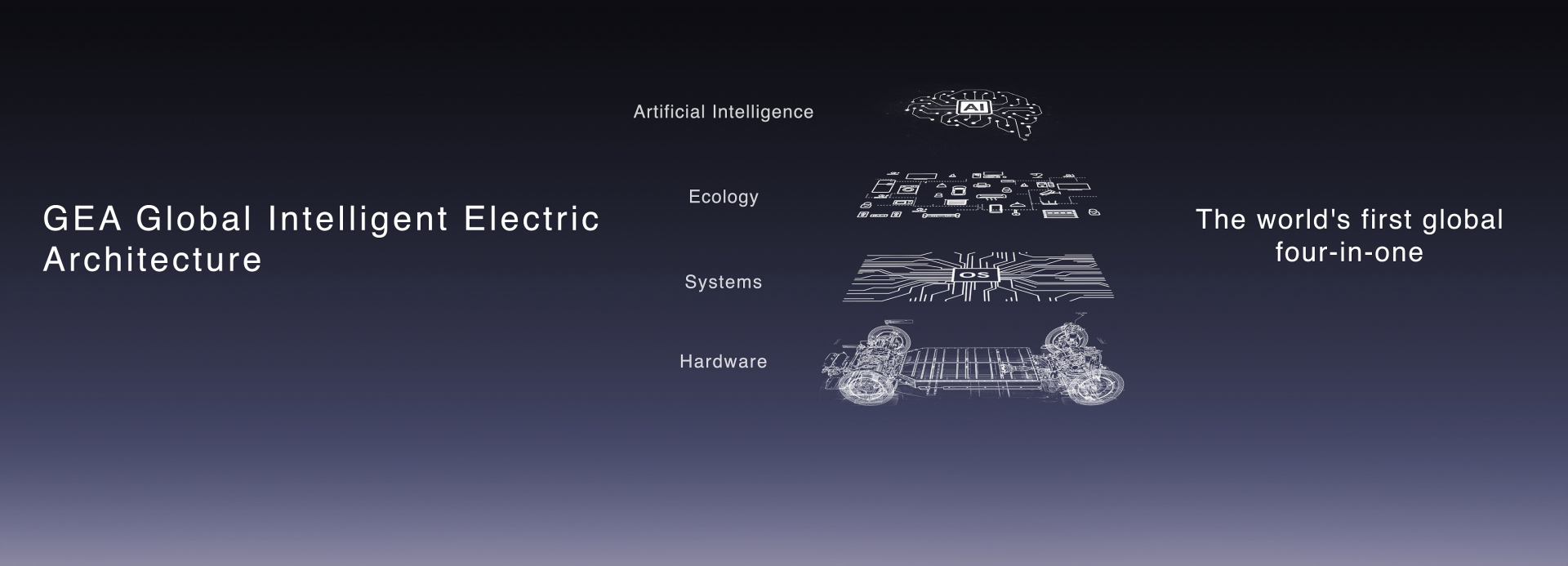 Globalna inteligentna nova energetska platforma GEA prva je četverostruka AI inteligentna platforma na svijetu koja kombinira "hardver, sustav, ekologiju i AI". Ona nudi značajna unaprijeđenja u prostornom dizajnu, inteligentnoj energiji, sveobuhvatnoj sigurnosti, AI inteligenciji i performansama vožnje. Podržava potpunu elektrifikaciju s mogućnostima poput čistog električnog, hibridnog, proširenog dometa i zelenog metanola, pružajući korisnicima širok i fleksibilan raspon mogućnosti napajanja. Dodatno, GEA 3.0 elektronička i električna platforma integrira napredne tehnologije poput multimodalne AIGC, AI digitalnog šasije i AI pametne vožnje, uvodeći novo doba sveobuhvatne AI inteligencije u proizvodnju vozila.