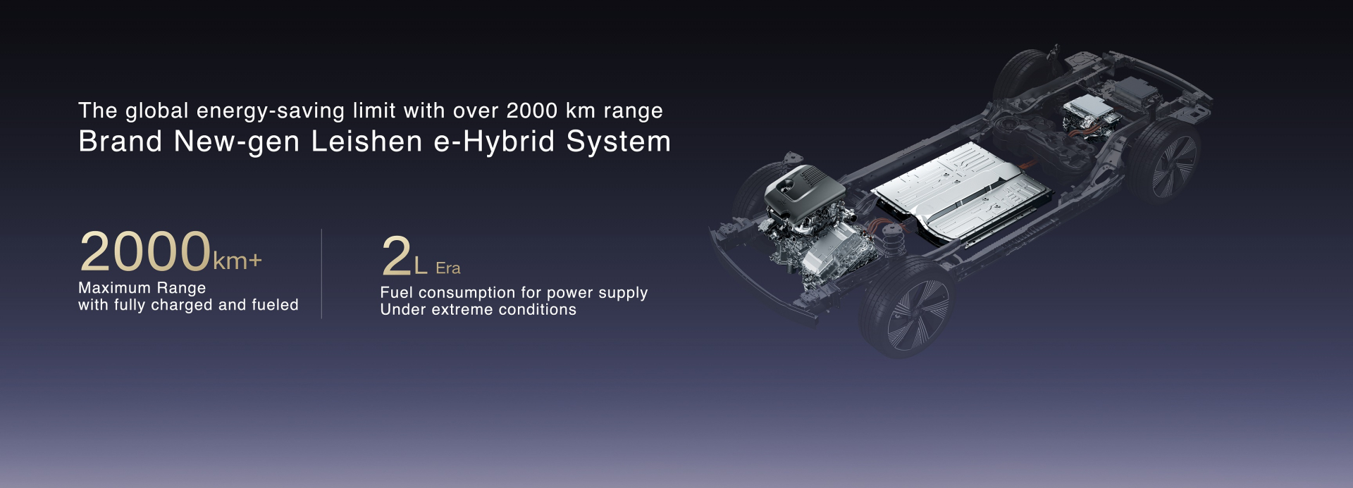 Inteligentni električni pogon 11-u-1 najlakši je, najmanji i najučinkovitiji inteligentni električni pogon u industriji, što mu je donijelo prvu "certifikaciju 5A razine za montažu električnog pogona". Pod CLTC uvjetima, njegova učinkovitost doseže vodećih 90,04% u industriji, čineći ga jedinim proizvodom u svojoj klasi koji premašuje 90%, prikazujući vodeće performanse u svijetu. Nova generacija hibridnog električnog pogonskog sustava Leishen postiže globalnu najvišu termičku učinkovitost od 46%, s dometom punog spremnika i punog baterijskog kapaciteta od preko 2000 km i minimalnom potrošnjom goriva od 2 litra.